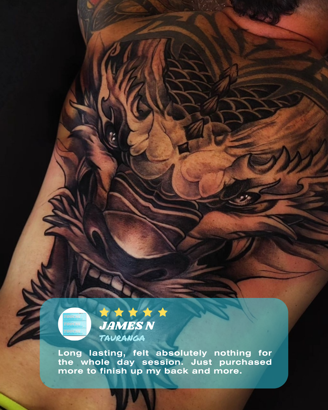 “Applied this 90mins before my tattoo and honestly I didn’t feel a thing . Absolutely would recommend and will be using in the future , thanks toochi ❤️!”