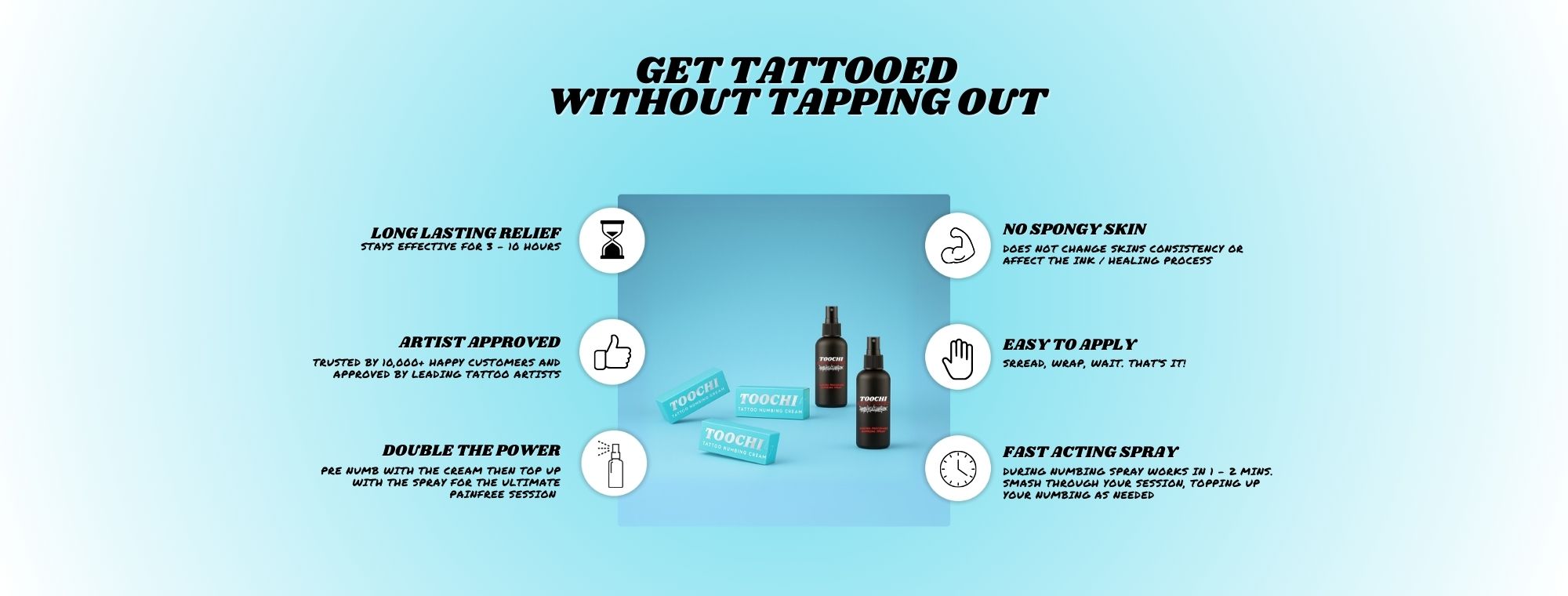 I used a lot of so called numbing cream but still can’t continue the tattoo sessions because during the process the numbing cream became not effective. And the client top out cause it’s feel so painful. But when I tried the TOOCHI TATTOO wow! I finished my full back piece with cover up within 2 consecutive days total of 16 hours. I’m happy with the product. Me and the client are very satisfied with TOOCHI Tattoo. I will purchase it again. Highly recommended. 10/10. 5 Stars.