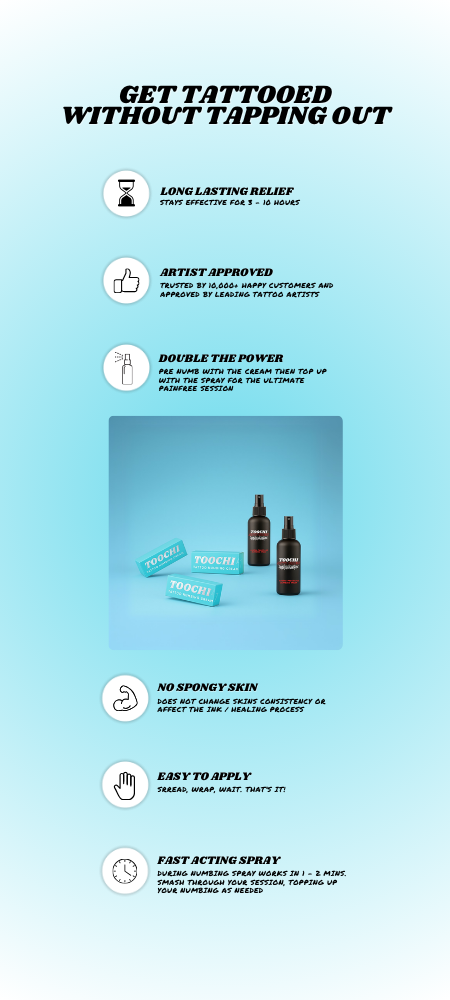 I highly recommend this cream! My tattooist couldn't believe I slept through the first 1.5hrs. My tattooist doesn't like numbing cream as it can affect the ink but he was impressed with toochi.